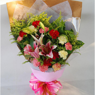 • 19朵各色康乃馨,1枝多头粉香水百合,黄莺,