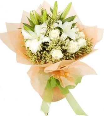 • 白玫瑰11枝,多头白百合2枝,水晶草
