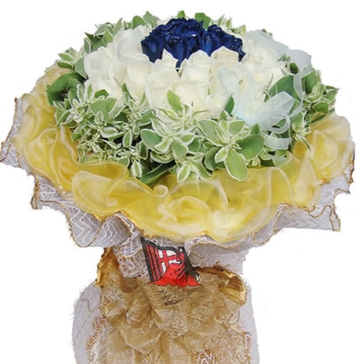 • [材 料]:24支白色玫瑰,9支蓝色妖姬,搭配高山积雪