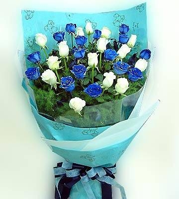 • 精品蓝玫瑰16朵,白玫瑰17朵,针叶松丰满