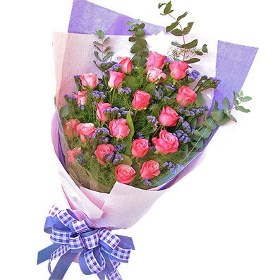 • 粉色玫瑰19枝,紫色勿忘我、尤加利(或者其他绿叶代替)点缀