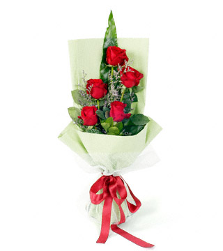 • [材 料]:红玫瑰5枝,线状叶材一片,情人草,栀子叶丰满