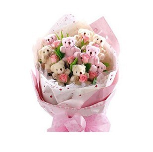 • [材 料]:9支粉玫瑰,9支可爱小熊(颜色和样式随机),