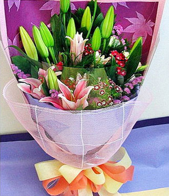 • 5枝多头粉色香水百合,勿忘我,黄莺等点缀;
