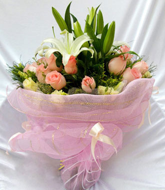 • [材 料]:2枝白香水百合,18枝戴安娜粉玫瑰,黄色色洋桔梗外围,衬草衬托;