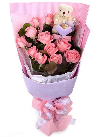 • 11枝粉色玫瑰。10厘米左右小熊,1颗巧克力金莎