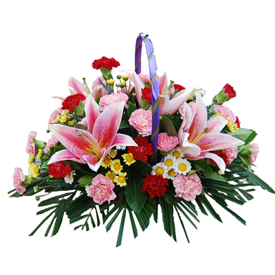 • [材 料]:2枝多头粉香水百合9枝红色康乃馨+9枝粉色康乃馨+小菊(或桔梗)点缀,散尾葵绿叶衬底。