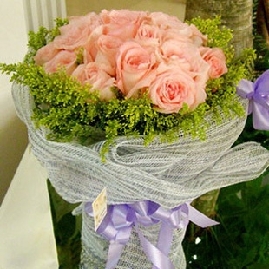 • [材 料]:18朵粉玫瑰,点缀黄莺