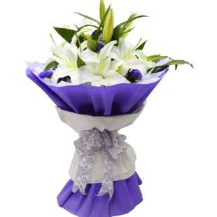 • [材 料]:7枝白色香水百合,紫色勿忘我点缀。