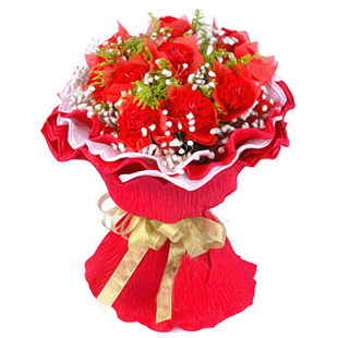 • [材 料]:19支红色康乃馨,满天星、黄莺间插