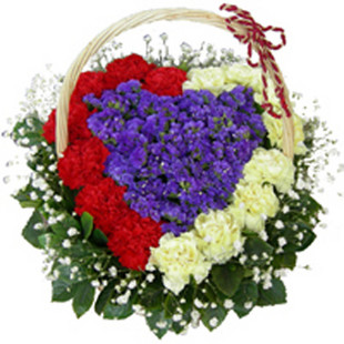 • [材 料]:11支红色康乃馨和11支黄色康乃馨围成一个心形图案,内衬紫色勿忘我,最外圈满天星和绿叶搭配