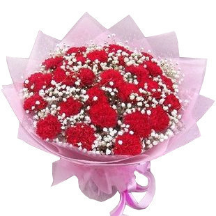 • [材 料]:24枝红色康乃馨,丰富满天星点缀