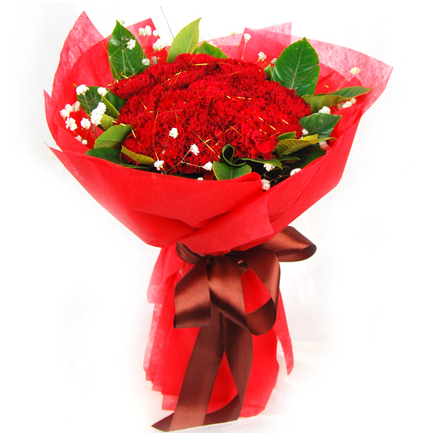 • 19枝红色康乃馨,外围绿叶、满天星.