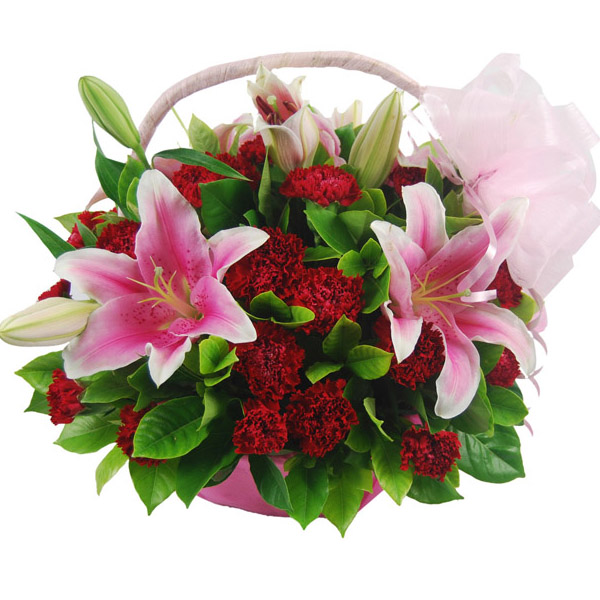 • 24枝红色康乃馨+3枝多头粉百合+绿叶配花.