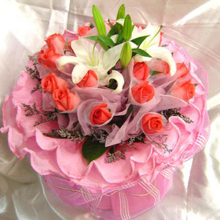 • [材 料]:21朵粉玫瑰(单头粉色棉纸包装)2支白色香水百合,配草