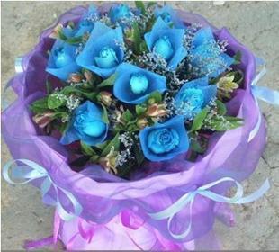 • 11朵蓝玫瑰(蓝色棉纸单支包装),绿叶、情人草点缀