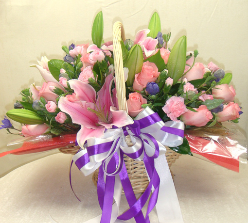 • [材 料]:20朵粉色康乃馨+16朵粉玫瑰+3支粉百合,绿叶、多头康点缀。