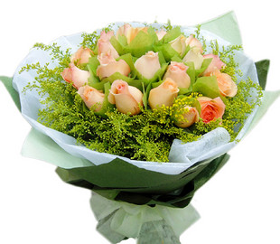 • [材 料]:香槟玫瑰19朵,黄莺外围。