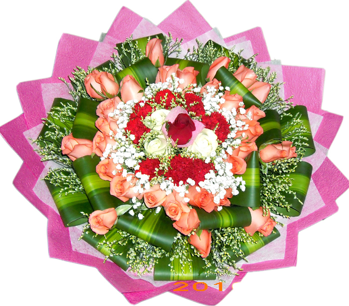 • 36朵粉玫瑰,3朵白玫瑰,1朵红玫瑰,红色康乃馨11朵,满天星+水晶草+巴西叶如图摆放包装。