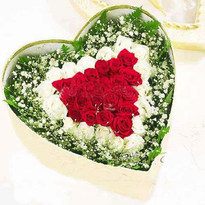 • [材 料]:15朵红玫瑰+18朵白玫瑰,满天星/绿叶外围,