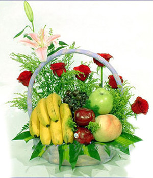 • [材 料]:6枝红玫瑰,1枝粉百合,搭配黄莺,水果(香蕉、苹果、桃子、葡萄、蛇果、芒果等时令水果)