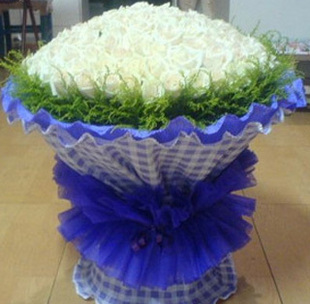 • [包 装]:蓝色+紫色格子卷边纸圆形包装。蓝色棉纸束腰装饰