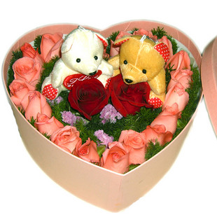 • 粉玫瑰19朵,红玫瑰2朵,小熊2只(小熊款式随机),配草+勿忘我点缀。