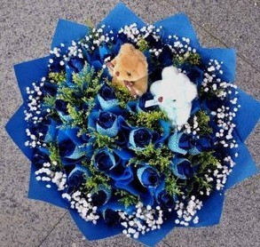 • [材 料]:19支昆明蓝色妖姬(单支包装),内衬黄莺外围满天星。赠送小熊2只(小熊款式随机)