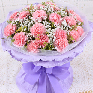 • 19支粉色康乃馨,黄莺+满天星搭配。
