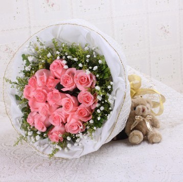 • [材 料]:19支粉玫瑰,黄莺+满天星外围点缀。赠送小熊公仔一只(高10厘米左右,款式随机)