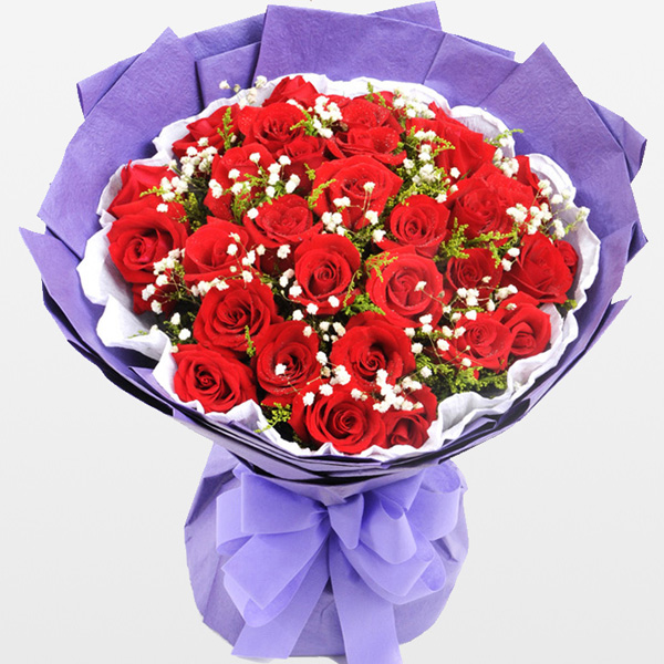 • [材 料]:33支红玫瑰,搭配满天星和黄莺,