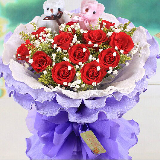 • 11朵红玫瑰,搭配满天星,黄英。(赠送两个小熊,小熊颜色随机)