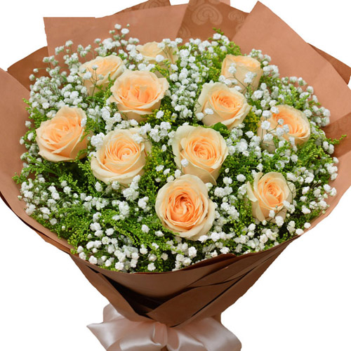 • [材 料]:精心挑选11朵昆明顶级香槟玫瑰、黄莺、满天星穿插其中