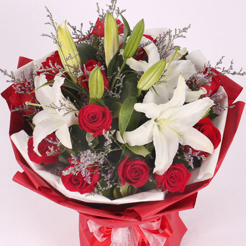 • [材 料]:19朵红玫瑰,3支多头香水百合,搭配情人草