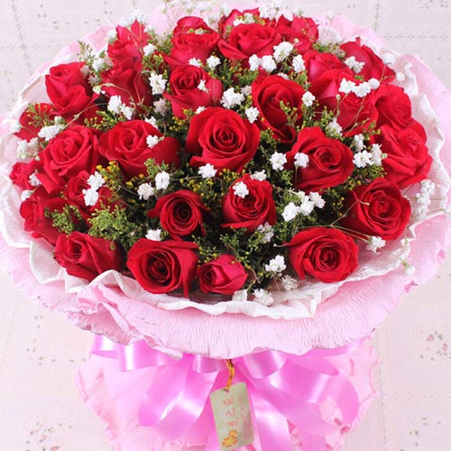 • [材 料]:33朵优质红玫瑰 黄莺搭配 满天星点缀