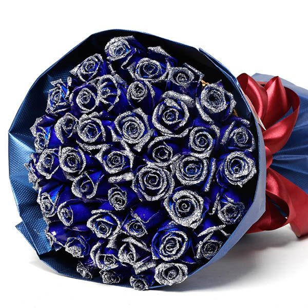 • 33枝精选A级蓝玫瑰花头点缀银色珠光粉